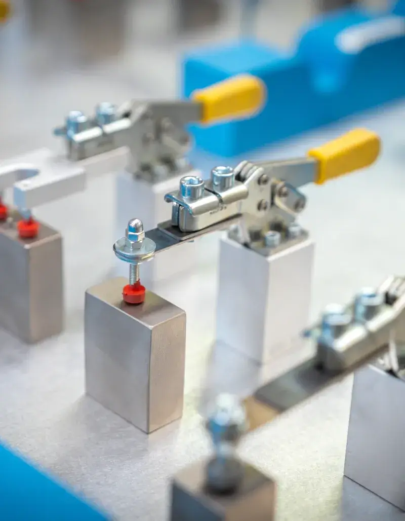 Le attrezzature sono composte da basi in alluminio o acciaio, spesso trattato superficialmente, su cui vengono montate sellette realizzate in materiali compatibili come alluminio, acciaio trattato o acciaio inox. La scelta dei materiali, così come l’altezza e la distanza delle sellette, viene definita in fase di progettazione in base al metodo di saldatura previsto. Le parti da unire sono mantenute nella corretta posizione tramite sistemi di chiusura manuali o pneumatici, mentre in alcune configurazioni sono previsti spessori calibrati e sostituibili che consentono di correggere volutamente la posizione dei componenti, tenendo conto delle variazioni dovute all’effetto termico della saldatura, per ottenere una geometria finale precisa e controllata.